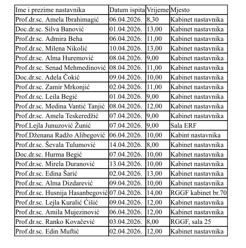 Ispitni termini za aprilski rok akademska 2025/26. godina