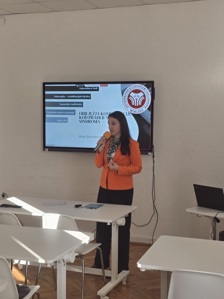 U okviru tečaja „Rijetke bolesti u neurologiji“, koji je održan u Osijeku od 27. do 28.02.2026. godine, pozivno predavanje održala je dr. sc. Silva Banović, docentica Edukacijsko-rehabilitacijskog fakulteta Univerziteta u Tuzli, koja je govorila na temu „Obilježja komunikacije kod Prader–Willi sindroma“. Navedeni skup je okupio brojne stručnjake iz područja neurologije, pedijatrije, interne medicine, psihijatrije, logopedije i drugih srodnih disciplina sa ciljem razmjene najnovijih znanja i iskustava u dijagnostici i rehabilitaciji osoba s rijetkim neurološkim bolestima.
